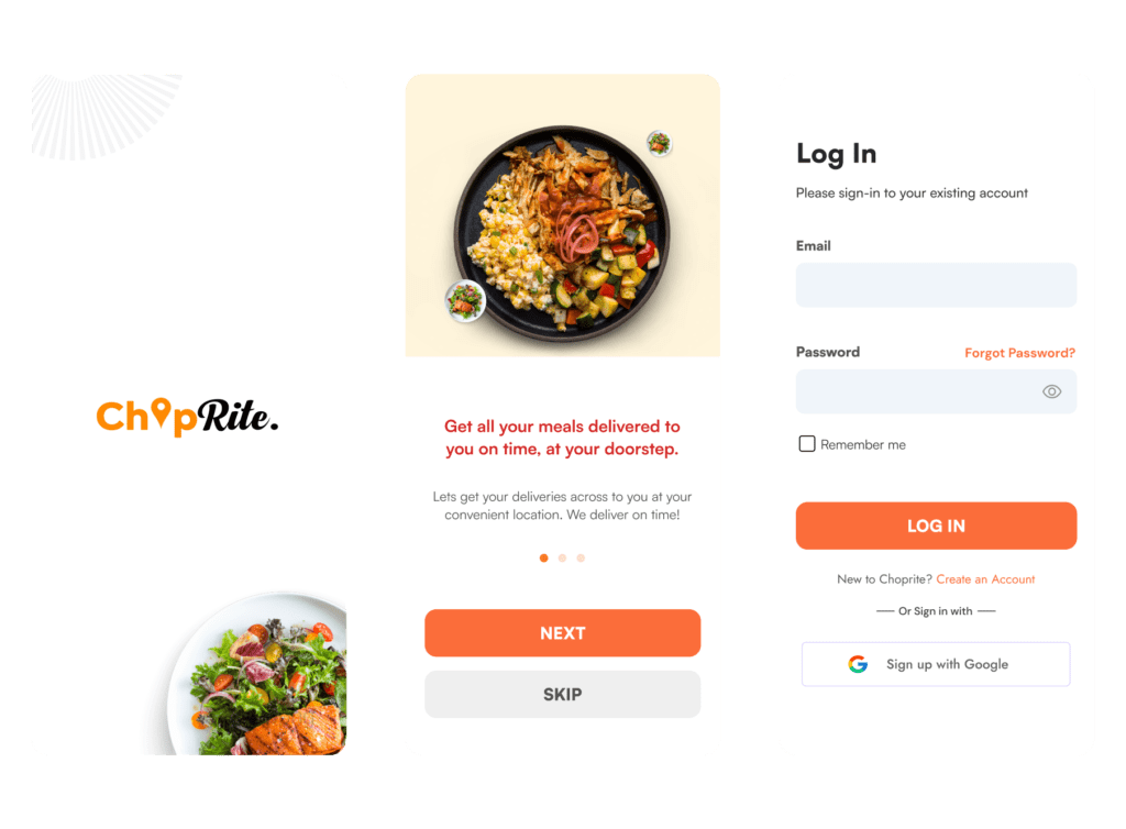 Choprite is a food ordering and delivery app that enable busy users and meal lovers to order any meal online and track the meals delivery. Choprite also allows users to chat with experts when they have specific orders. Our target audience are young people who lives in suburban areas in Nigeria.